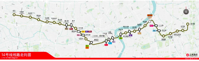 14號線是繼1、2號線之后又一條8節(jié)編組線路,也是首條采用8節(jié)A型列車編組的高密度大運量全自動無人駕駛線路。全線途經(jīng)嘉定、普陀、靜安、黃浦及浦東新區(qū)5個區(qū),運營里程約38公里,共設(shè)31座車站,其中有13座位于內(nèi)環(huán)以內(nèi),約占總數(shù)的40%,14號線可與軌道交通網(wǎng)絡(luò)中其他13條軌道交通線路換乘,開通后將進(jìn)一步提升軌道交通路網(wǎng)的運能運力,加強(qiáng)浦東、浦西過江聯(lián)系,有效緩解城市東西部和核心區(qū)重要交通走廊的緊張狀況,改善市區(qū)交通結(jié)構(gòu)和環(huán)境,發(fā)揮網(wǎng)絡(luò)整體效益。